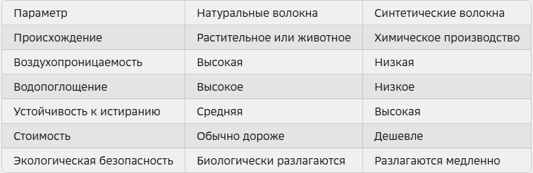 - Комфорт: Натуральные волокна обеспечивают комфорт при ношении благодаря своей мягкости и способности впитывать влагу.
